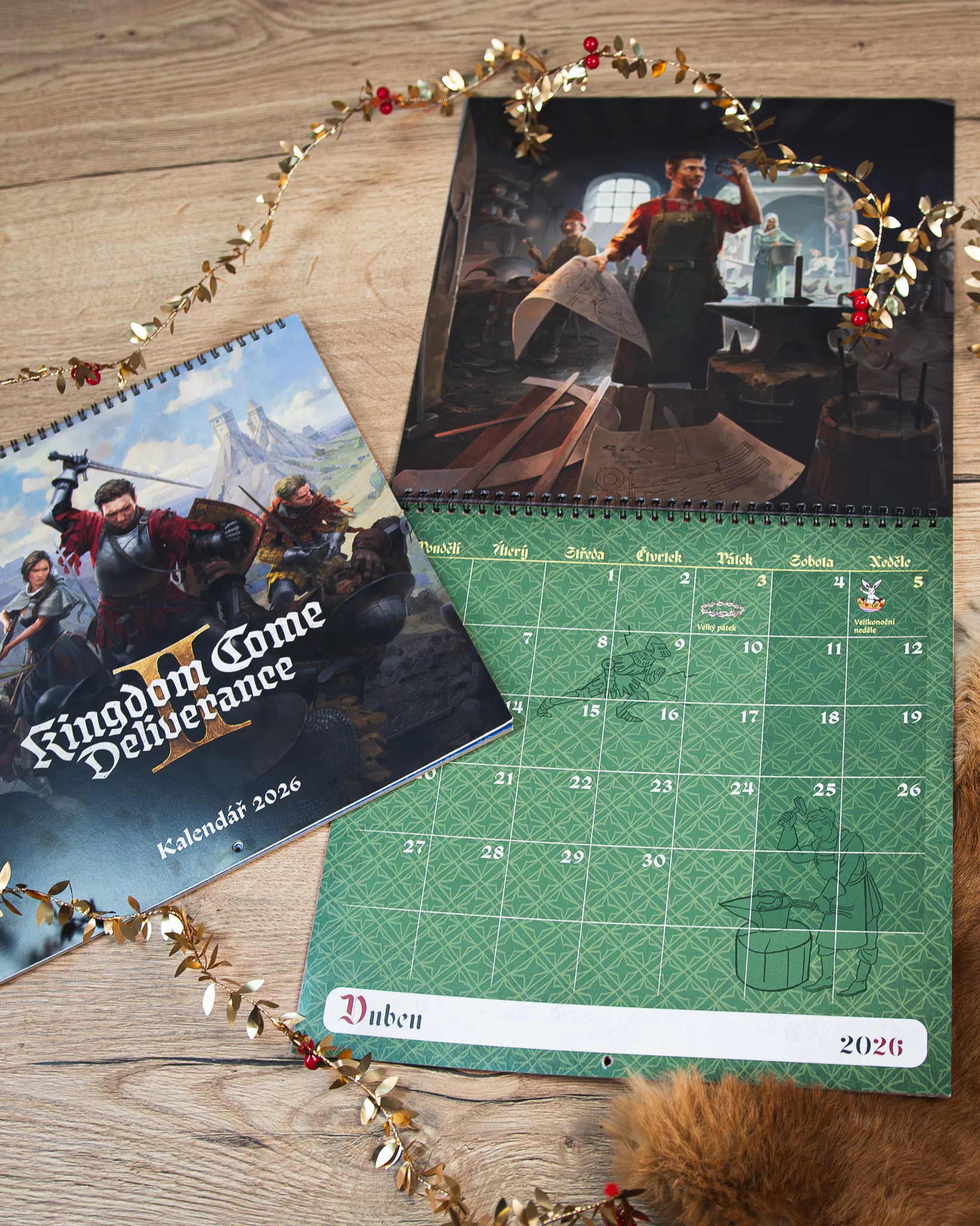Užijte si celý rok ve společnosti Kingdom Come: Deliverance II. Každý měsíc zdobí nádherné ilustrace ze hry, které zachycují atmosféru příběhu Jindřicha i krásu historických míst od Kutné Hory po české hrady a vesnice.