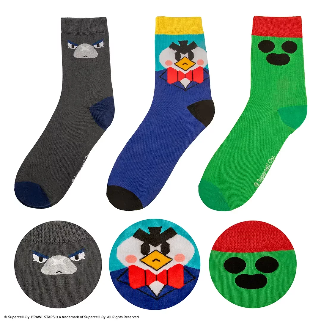 Vneste do šatníku trochu herní energie. Tento set tří ponožek z Brawl Stars představuje trojici oblíbených bojovníků, Spikea, Crowa a Mr. P, každý s vlastním výrazným designem.