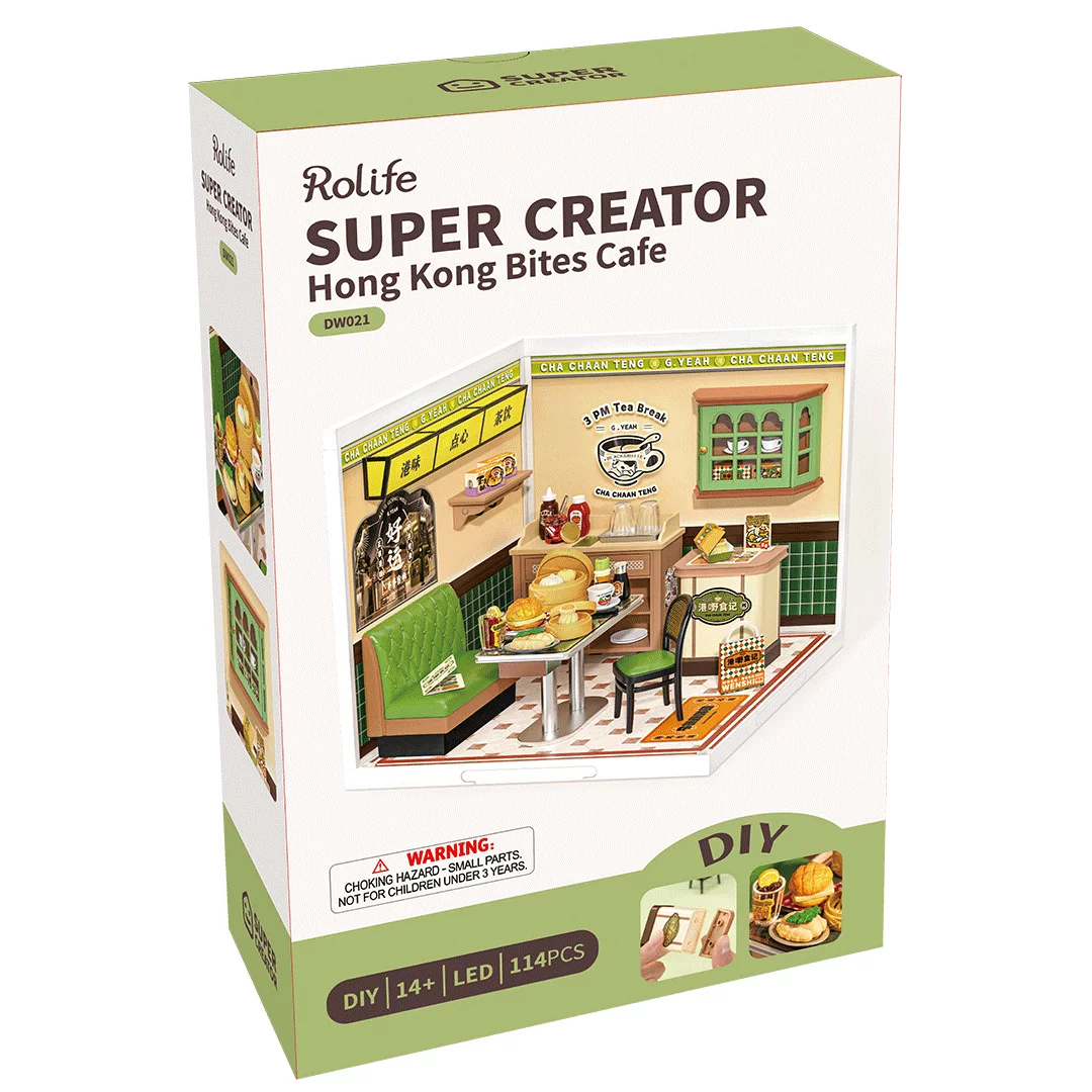 Detailně propracovaná DIY miniatura domu inspirovaná ikonickou čajovou kulturou Hongkongu, která zachycuje místní speciality, stylový interiér a modulární, stohovatelný design ze série Rolife Super Creator.Velikost: 163 x 176 x 152 mm